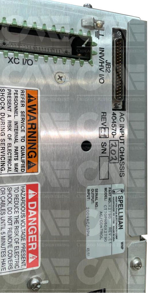 Toshiba – CT Scanner – AC/Control Spellman CT70PN60X2790 AC Input Chassis 404570-202 Rev. C1 – X2790 Rev. C replacement part available for sale. This component has been tested for functionality.