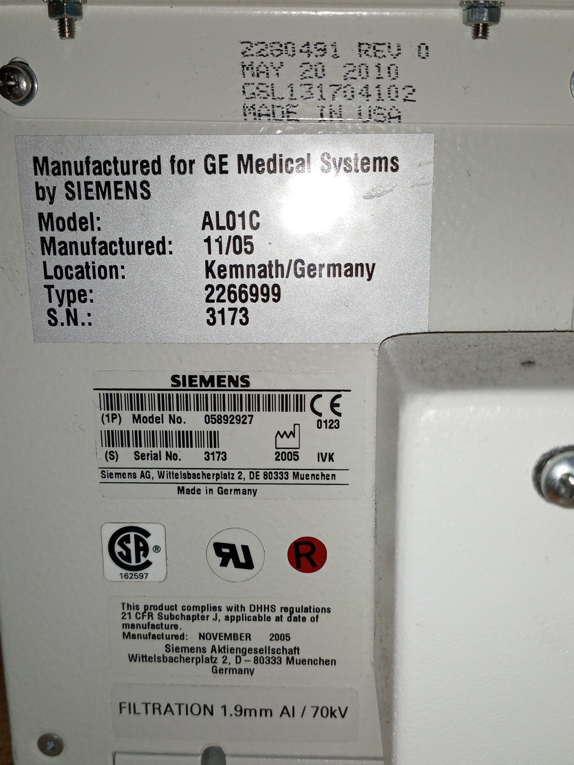 Siemens – GE AL01C Collimator by Siemens 05892927 – 2266999 replacement part available for sale. This component has been tested for functionality.