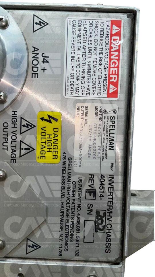 Contact Chicago Medical Engineering for pricing and availability of this Toshiba – INV/HV ANODE Spellman CT70PN60X2790 Inverter/HV Chassis 404514-202 Rev. F – X2790 Rev. F. We offer fast shipping across the United States.